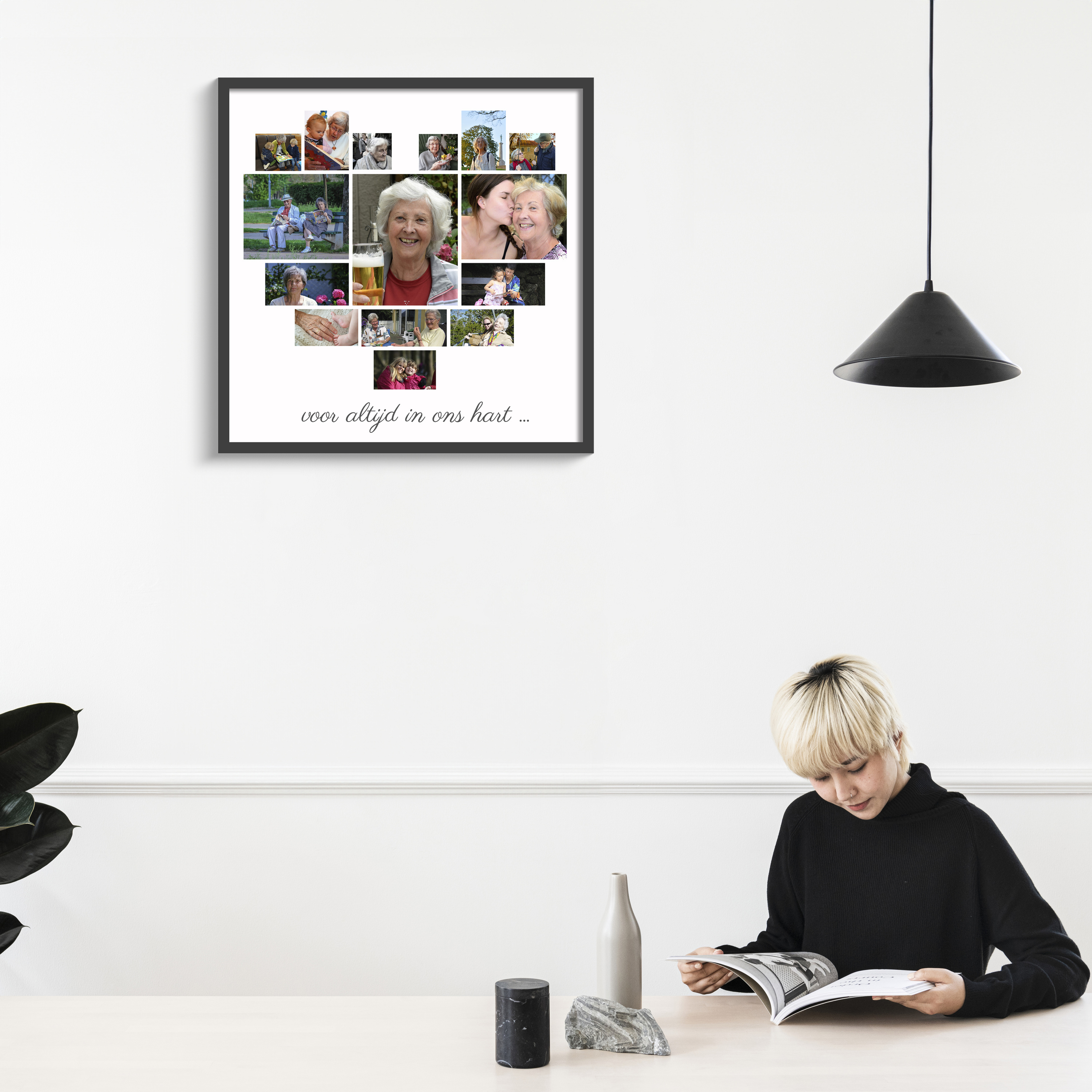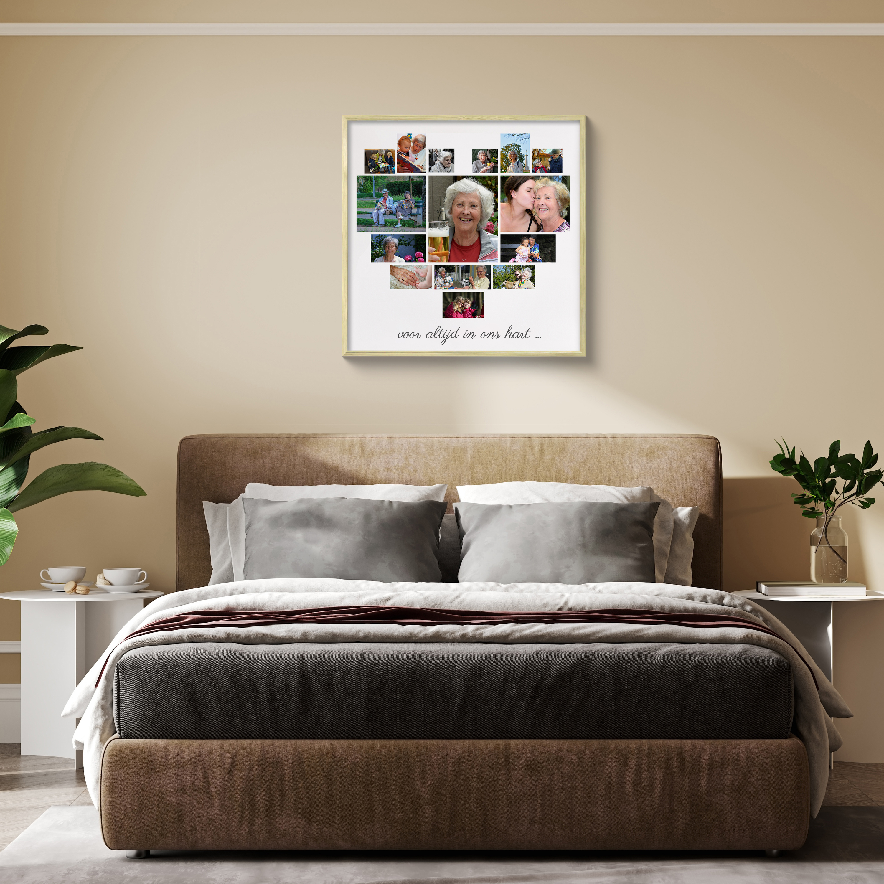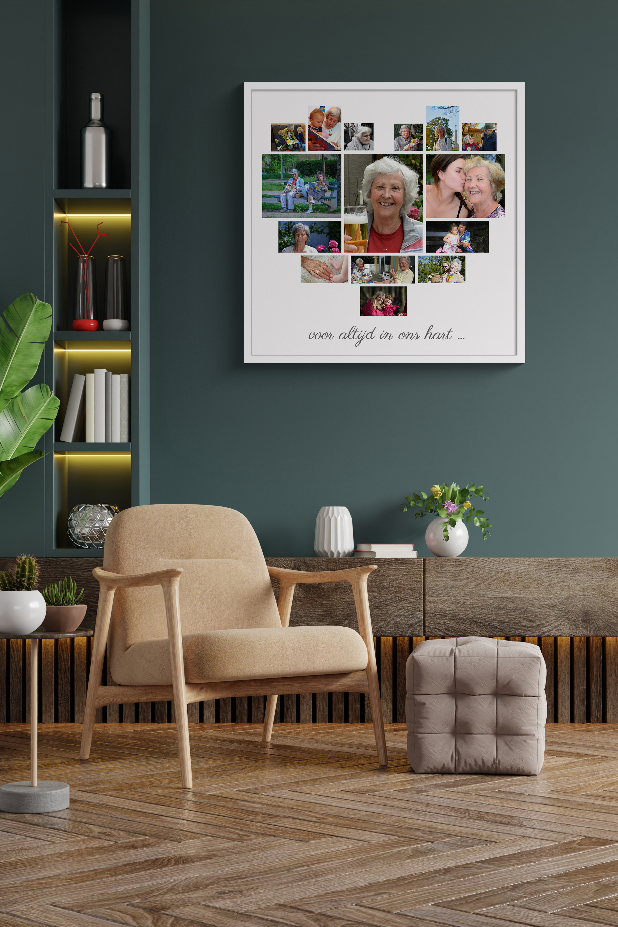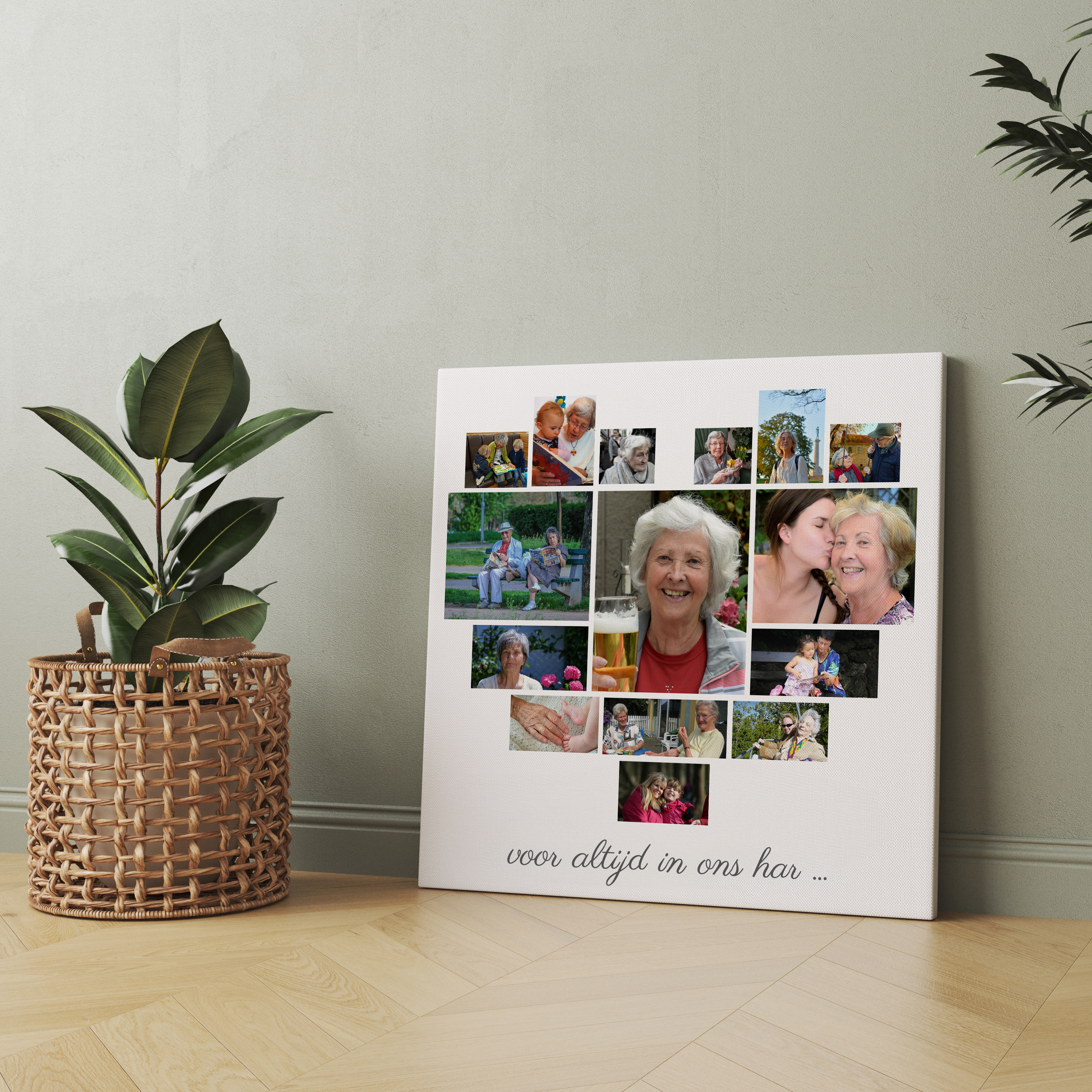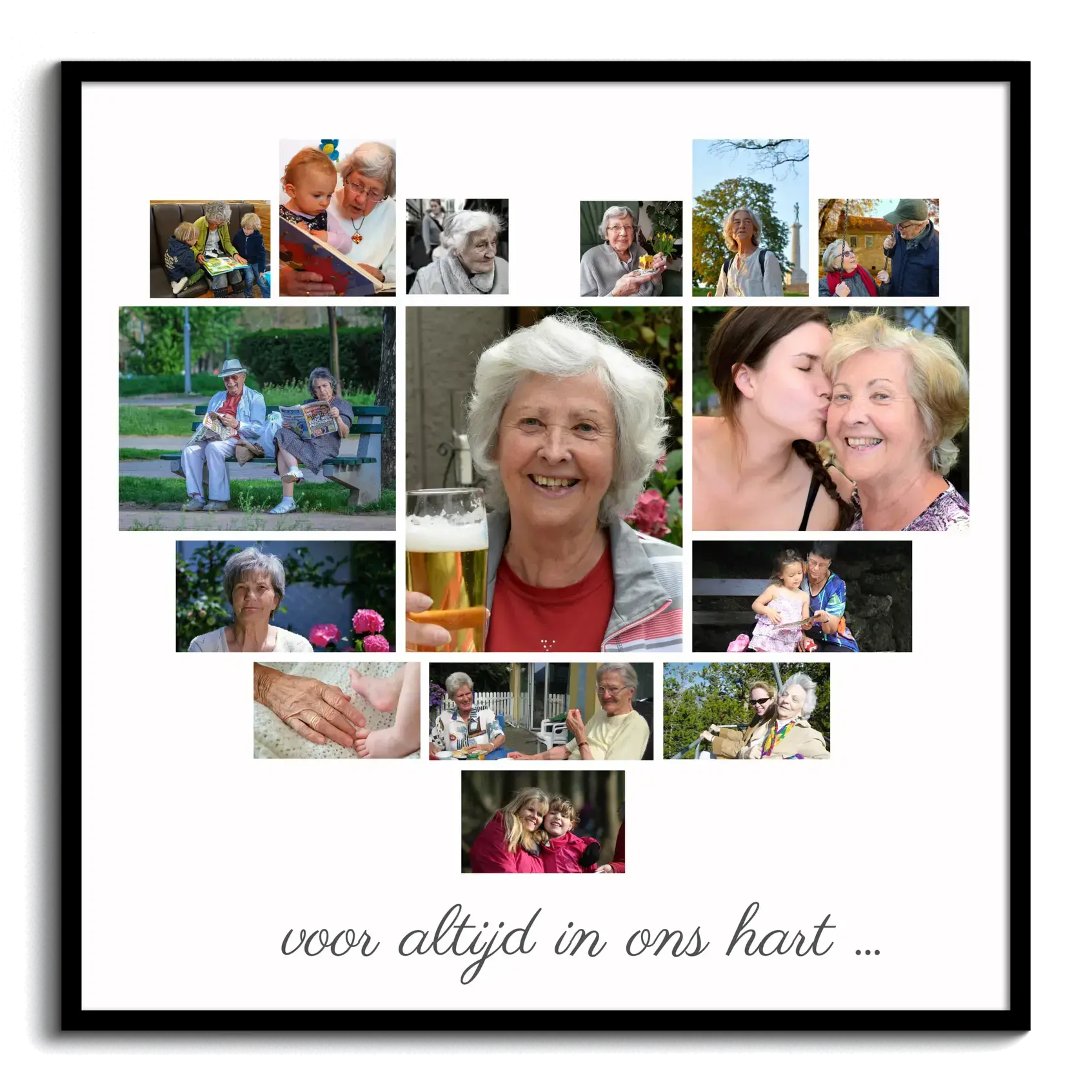 Maak je eigen unieke Fotocollage in hartvorm en geef je herinneringen een speciaal plekje. Stel je voor hoe prachtig het eruit zou zien als je een collage met je favoriete foto's van oma maakt die samen een hart vormen. In het midden een groter foto met de tekst: voor altijd in ons hart. Perfect als cadeau voor oma of als eerbetoon.