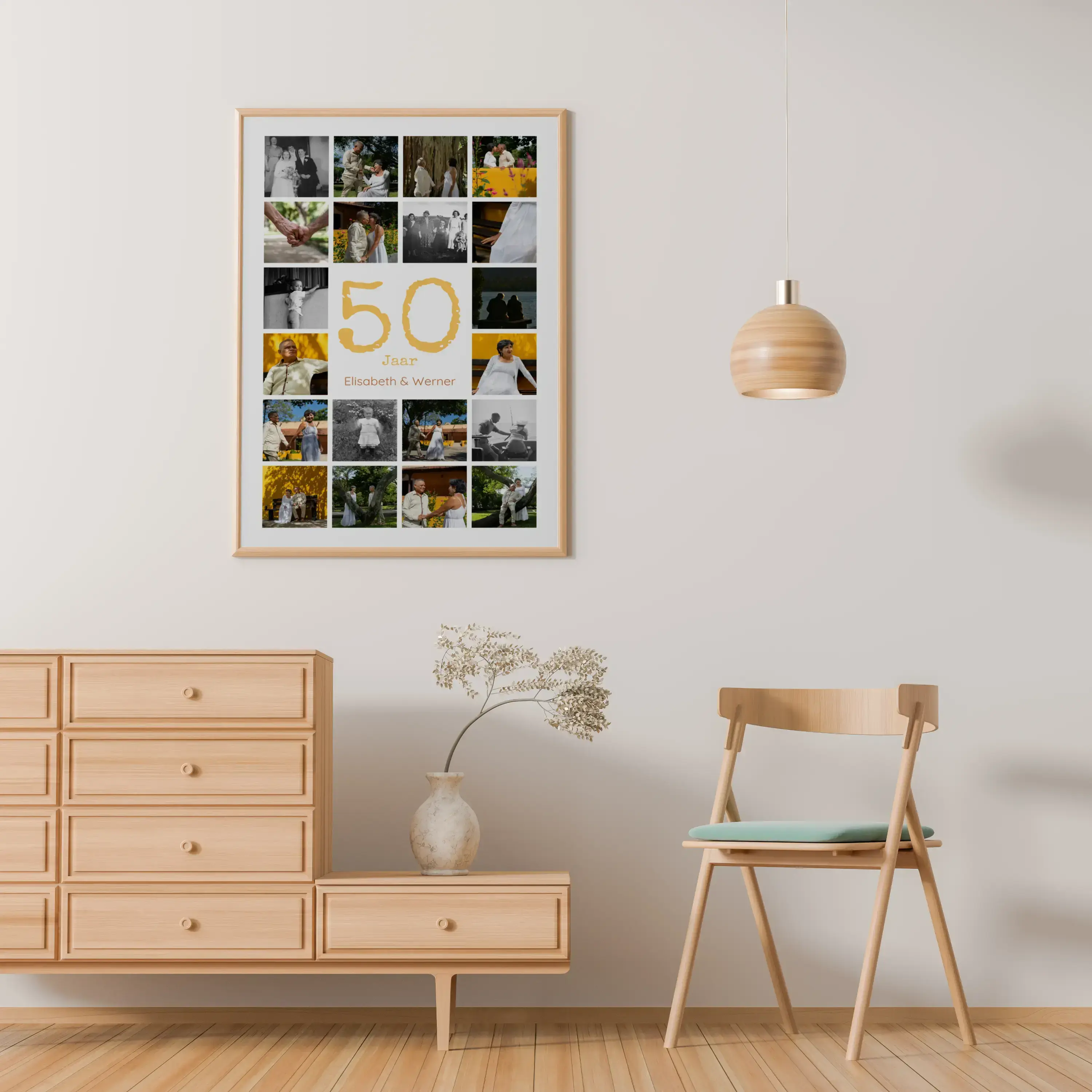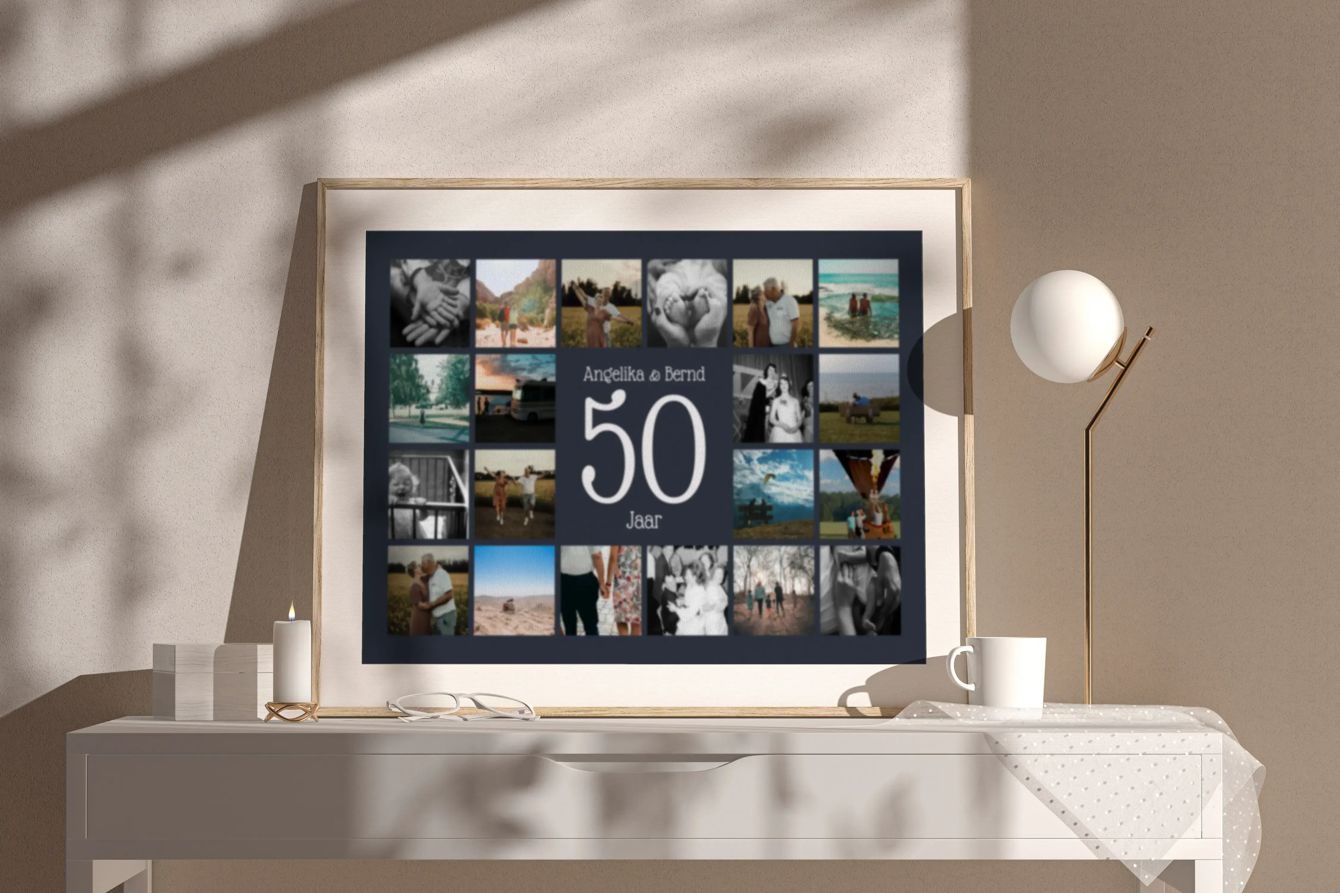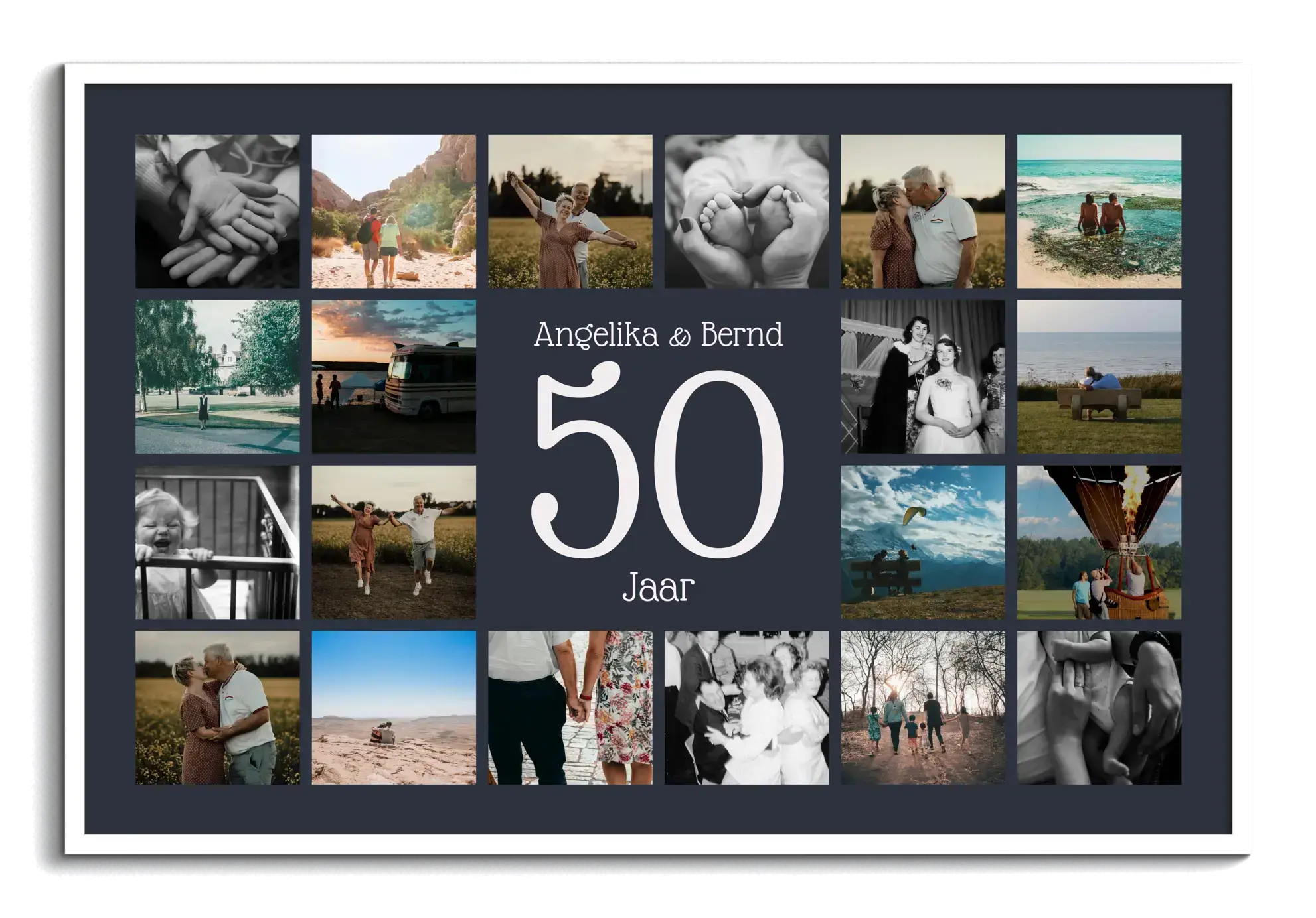 Jubileumcijfer-collage voor gouden huwelijk: 50 in het midden, namen/tekst, 20-80 foto's in raster.