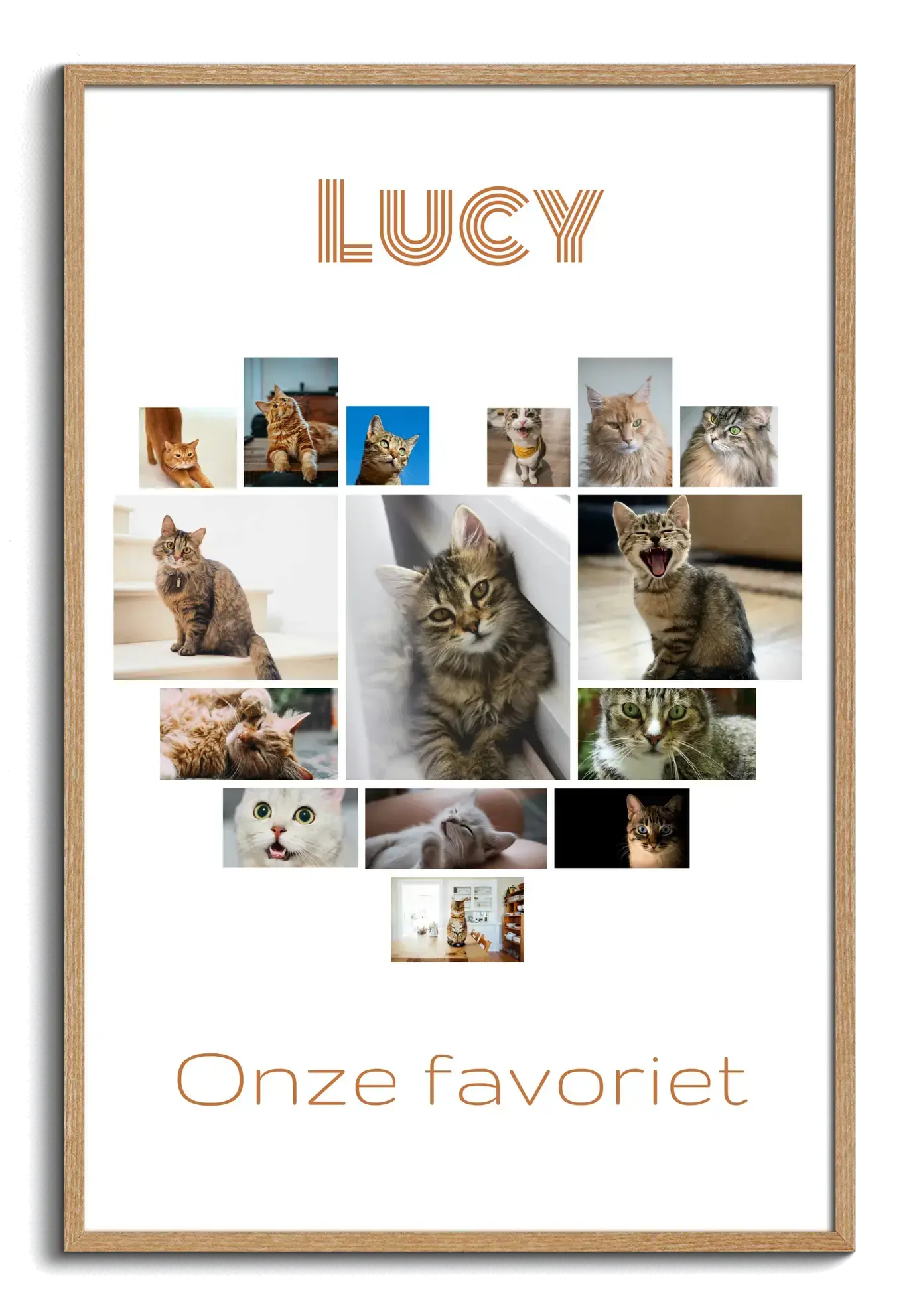 Maak nu je eigen kattenliefde in beeld: plaats je favoriete kattenfoto’s in een hartvormige collage, kies de afmeting en voeg een persoonlijke tekst toe, zoals Onze lieveling of de naam van je kat. Snel gemaakt en meteen een warme blikvanger in huis, of een verrassend cadeau voor elke kattenfan.