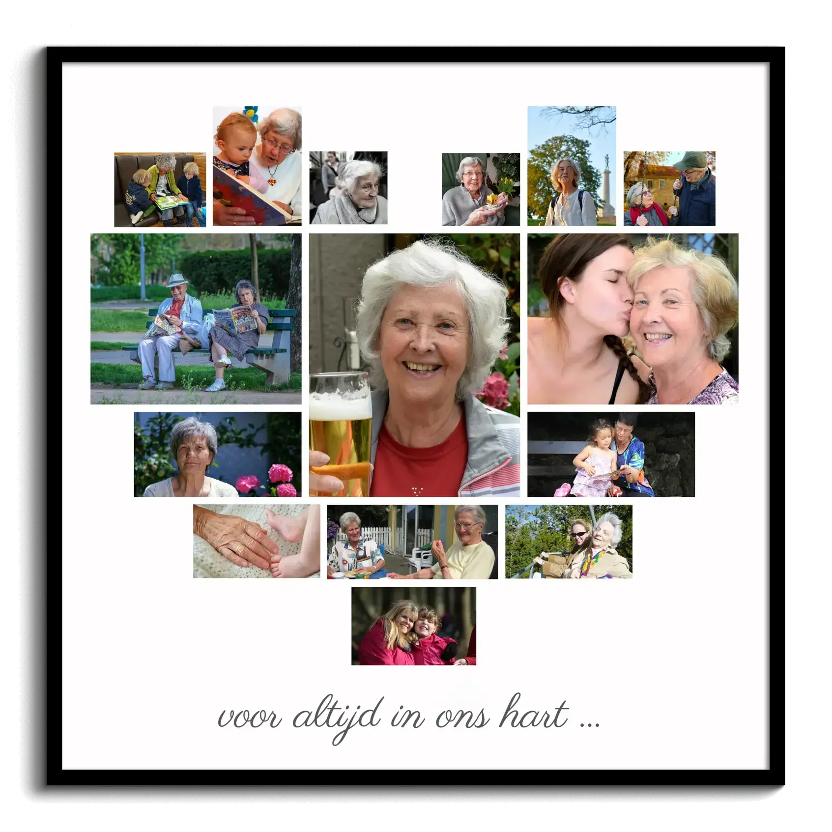 Herdenk je geliefde met onze hartvormige fotocollage: "voor altijd in ons hart"