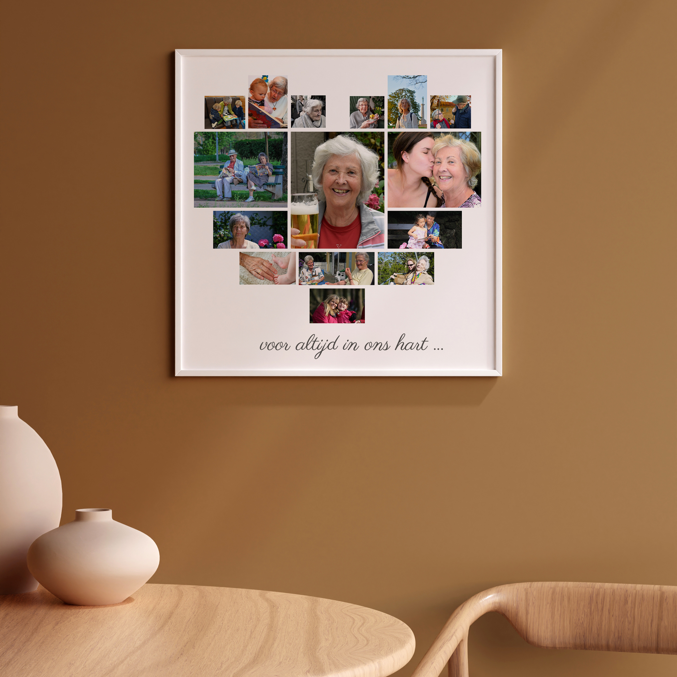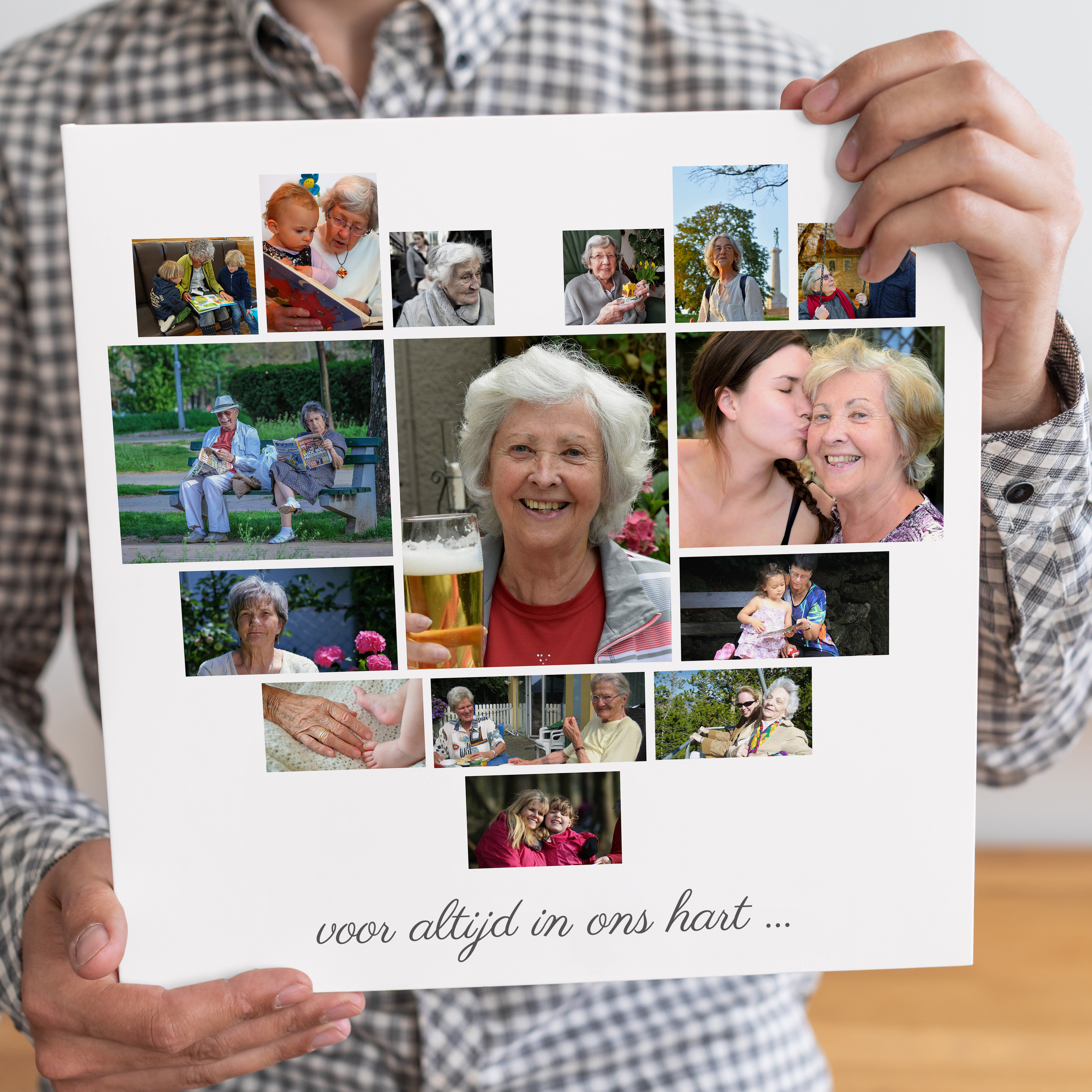 Maak je eigen bijzondere fotocollage met onze gebruiksvriendelijke web-app. Stel een hartvormige collage samen als een dierbare herinnering in tijden van verdriet. Dit product bevat 15 foto's die samen een hart vormen, vergezeld van de tekst: voor altijd in ons hart. Pas de foto's en tekst eenvoudig aan om een persoonlijk eerbetoon te creëren. Geschikt voor zowel de plechtigheid als thuis als een tastbare herinnering of geschenk.