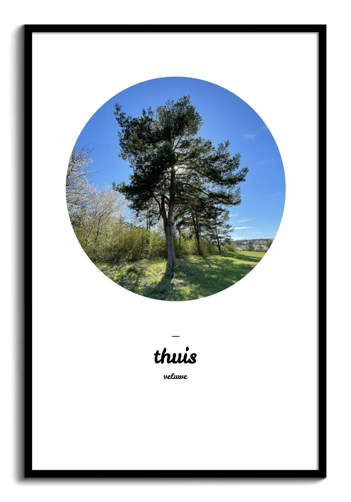 Ontwerp je eigen unieke kunstwerk en vereeuwig je favoriete herinneringen op een stijlvolle manier. Deze fotocollage in hoogformaat heeft een ronde foto in het bovenste derde deel, met daaronder ruimte voor een tekst. Personaliseer met woorden zoals "Heimat" en voeg de naam van jouw favoriete plek toe. Perfect voor iedereen die zijn verbondenheid met hun omgeving visueel wil vastleggen.